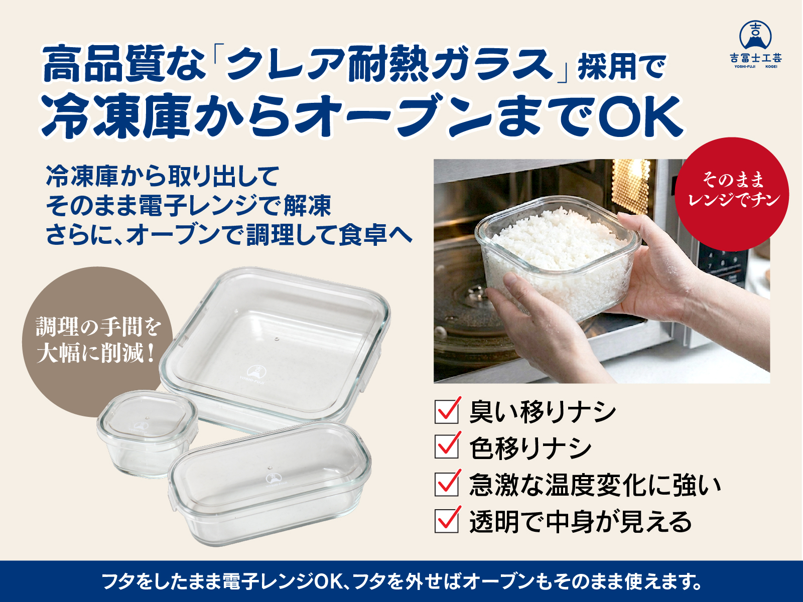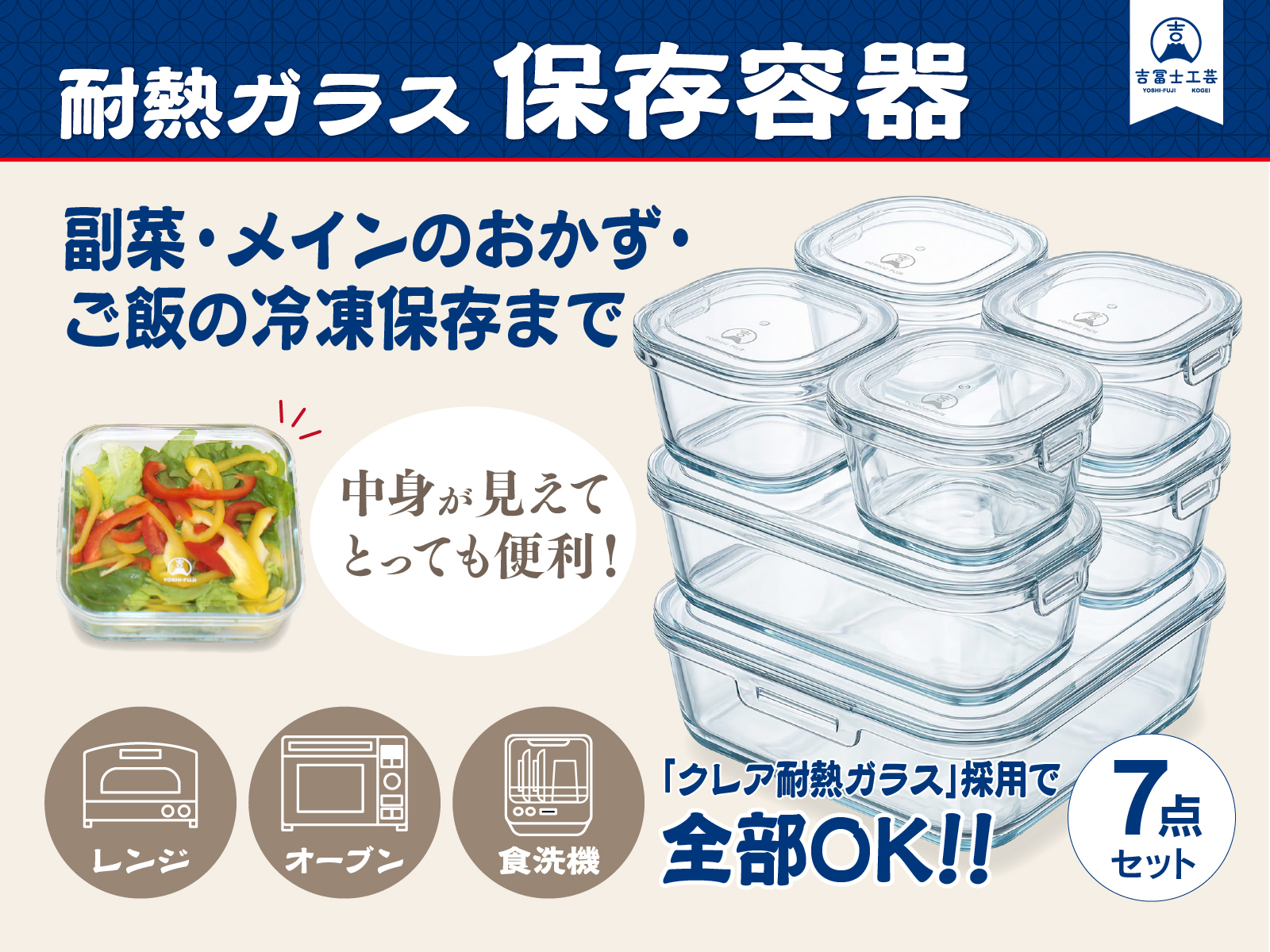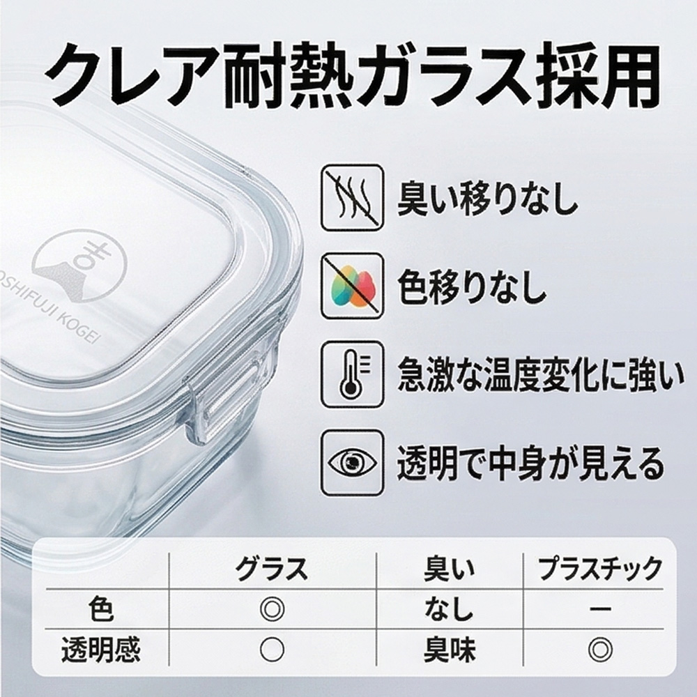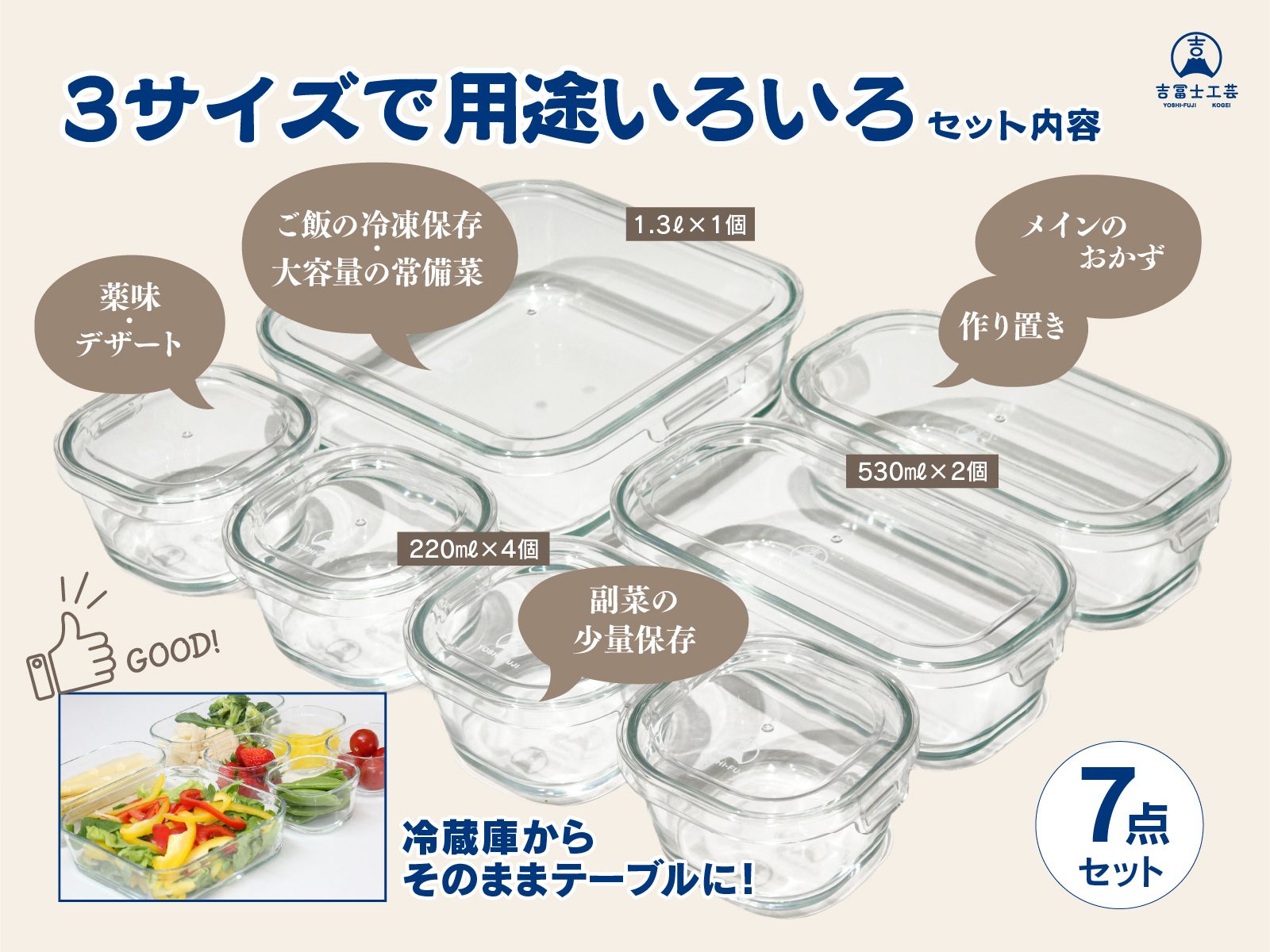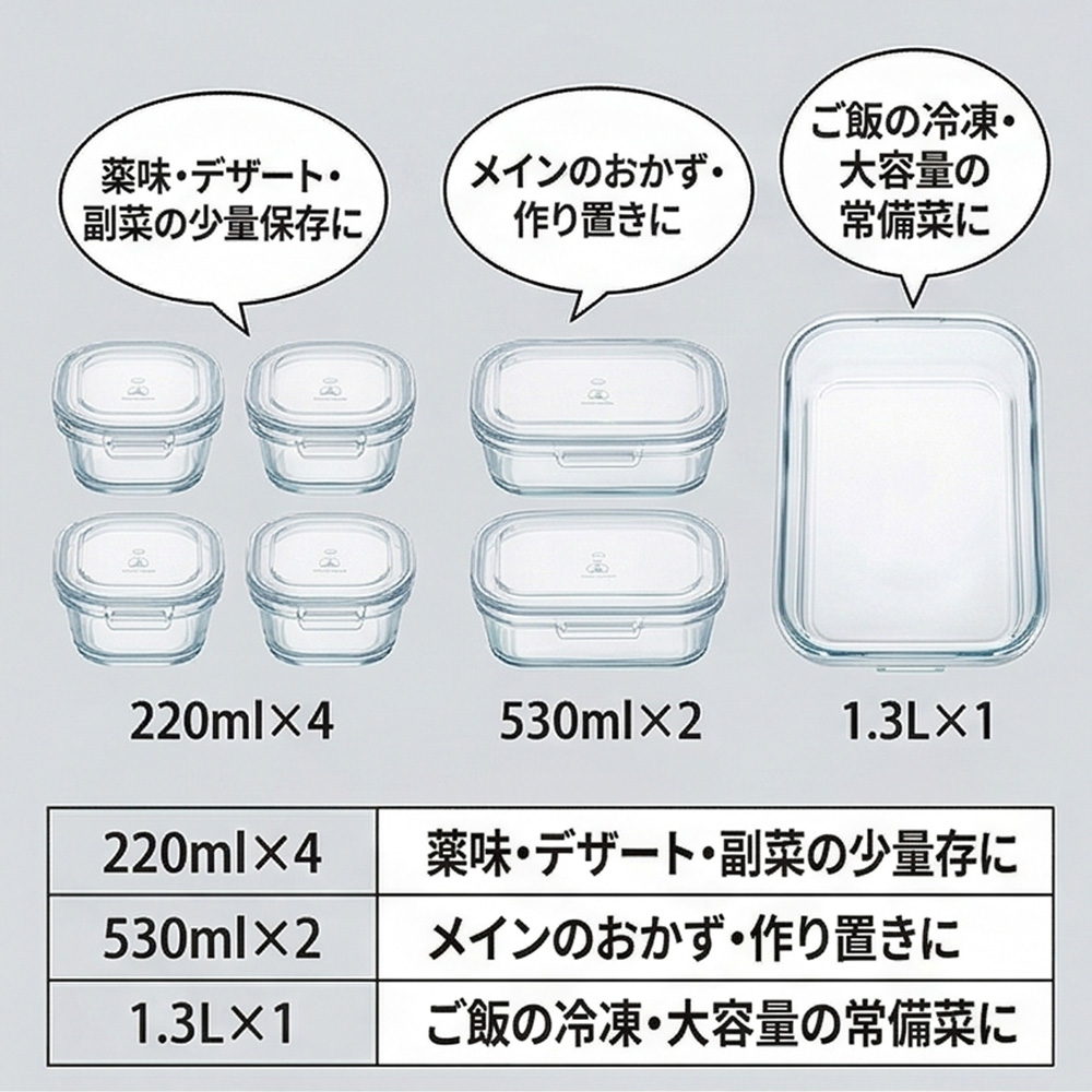耐熱ガラス 保存容器¥3,860 耐熱ガラス 保存容器 7点セット 吉冨士工芸の耐熱ガラス保存容器は、高品質なクレア耐熱ガラスを使用した 220ml×4個・530ml×2個・1.3L×1個の充実7点セットです。 (蓋はオープン対応しておりません、ご了承ください。) - 耐熱ガラス 保存容器個 + お買い物カゴに追加 商品コード: SF-0MXN-I5AY カテゴリー: 保存容器 説明 追加情報 説明 追加情報 セット内容 220ml × 4、530ml × 2、1.3L × 1
